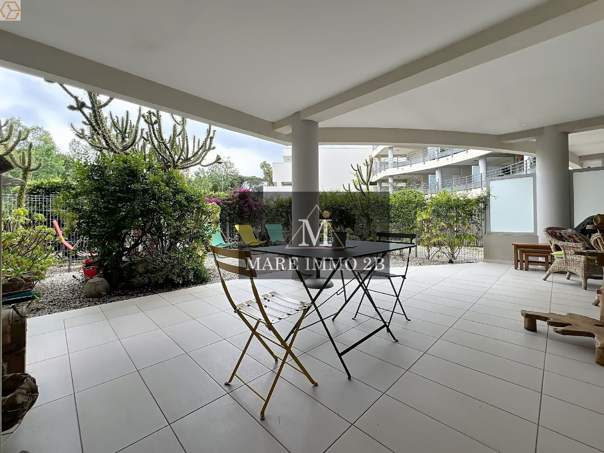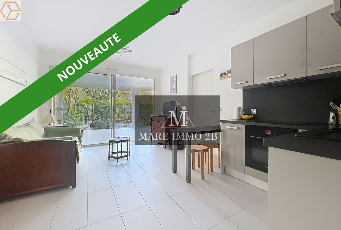 Cuisine équipée ouverte sur un salon avec accès à une terrasse de 32m² et un jardin de 36m².