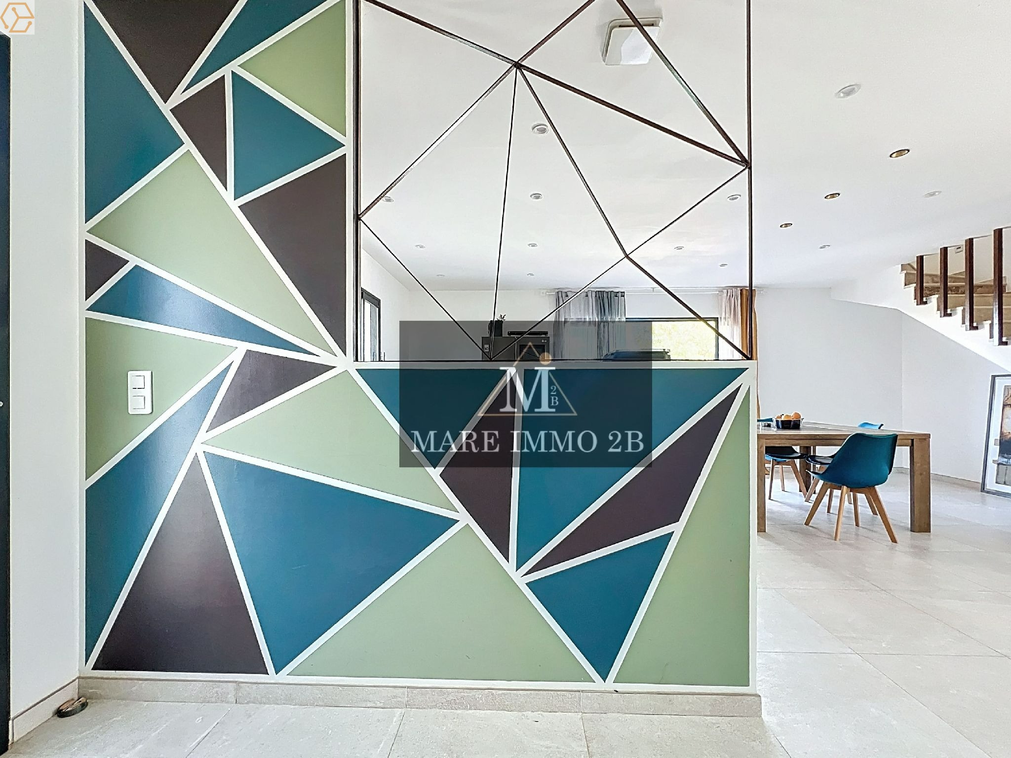 L’entrée donne sur un vaste et lumineux espace de vie. Le salon et la salle à manger bien définis. La cuisine ouverte est entièrement aménagée et semi équipée.