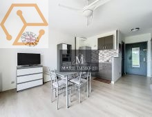 Le studio dispose d'une salle d'eau avec toilettes. De nombreux rangements intégrés optimisent l'espace.